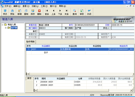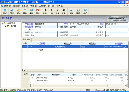 出”或點(diǎn)擊相應(yīng)圖標(biāo),將選定的制造批號轉(zhuǎn)成制造入庫單